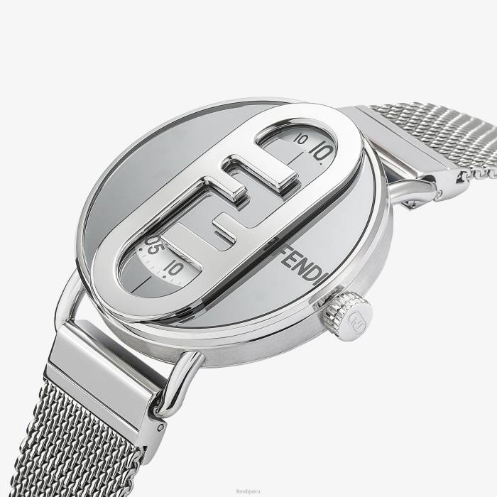 Caja redonda de acero inoxidable, color plateado, brillante y satinado, de 42 mm, con óvalo Fendi o’lock que muestra la hora. Corona con logo ff grabado. Esfera opaca de cristal de zafiro plateado con logotipo Fendi negro. Esferas de horas, minutos y segundos con fondo plateado claro y números en negro y gris claro. Brazalete de malla de acero inoxidable con hebilla desplegable con logotipo de Fendi grabado.