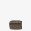 Neceser de maquillaje cilíndrico con asa y doble cremallera. Confección en tela con motivo ff marrón y tabaco. adornado con detalles de cuero marrón y tirador de cremallera de cuero con letras fendi roma. Forro de tela lavable. Artículos metálicos con acabado en paladio.