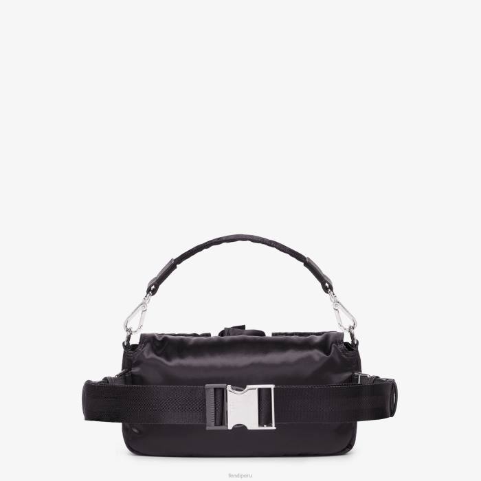 Bolso multibolsillos baguette confeccionado en nailon reciclado brillante de color negro, con cinco bolsillos de parche de diferentes tamaños. los bolsillos y la solapa delantera están decorados con el icónico cierre ff. adornado con cuero negro.