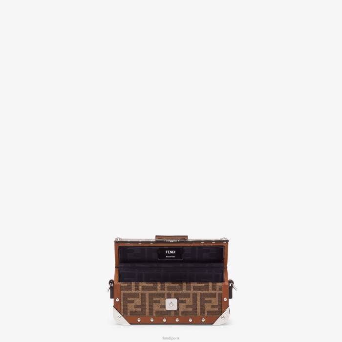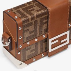 Bolso baguette rígido con solapa cuadrada y cierre magnético ff. la correa cruzada es ajustable y desmontable. Confeccionado en tela con motivo ff. adornado con detalles de cuero marrón y tachuelas. forrado con ff lycra. Artículos metálicos con acabado en paladio.