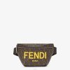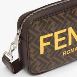 Bolso bandolera compacto con cierre de cremallera. La correa cruzada para el hombro de tela técnica con la marca “fendi” es ajustable y desmontable. Confección en tejido texturizado con motivo ff marrón y estampado fendi roma amarillo. adornado con detalles en cuero marrón. Interior organizado con un bolsillo plano. Artículos metálicos con acabado en paladio.