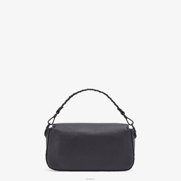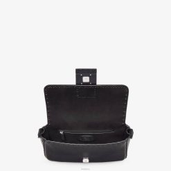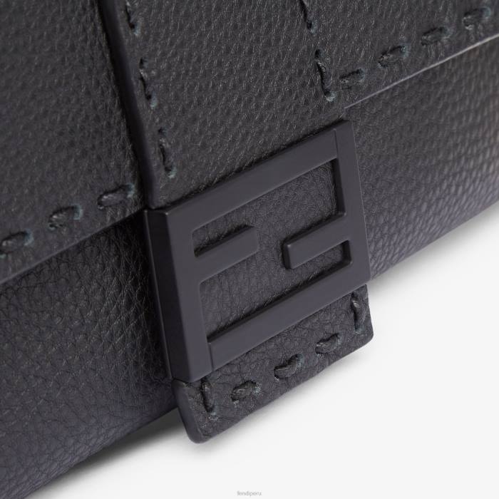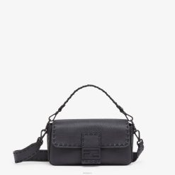 Bolso baguette confeccionado en piel cuoio romano negra y adornado con costuras tonales cosidas a mano. solapa cuadrada con cierre magnético ff.