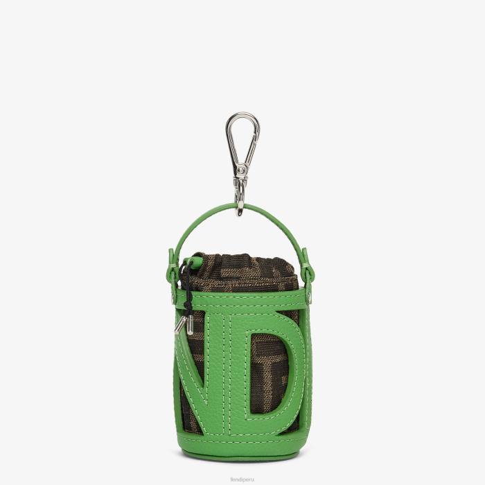 Charm en forma de bolso tipo cubo con cordón. Se puede fijar mediante el clip situado en la parte superior. Confeccionado en piel flor verde. Forrado en tela ff marrón y tabaco. Artículos metálicos con acabado en paladio.