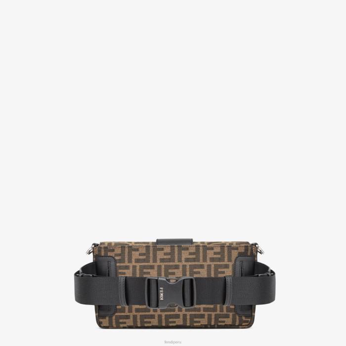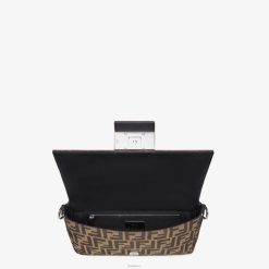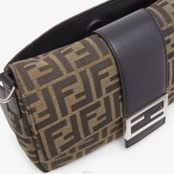 baguette regular con solapa cuadrada y cierre magnético ff. Se puede llevar como riñonera, utilizando la correa que se saca del bolsillo exterior de la parte trasera, o como bolso de hombro o cruzado, fijándole las correas desmontables. forro con bolsillo con cremallera. hecho con tela marrón. Acabado con motivo FF de jacquard por toda la prenda. Artículos metálicos con acabado en paladio.