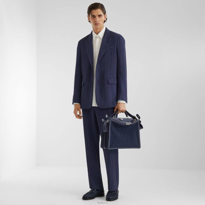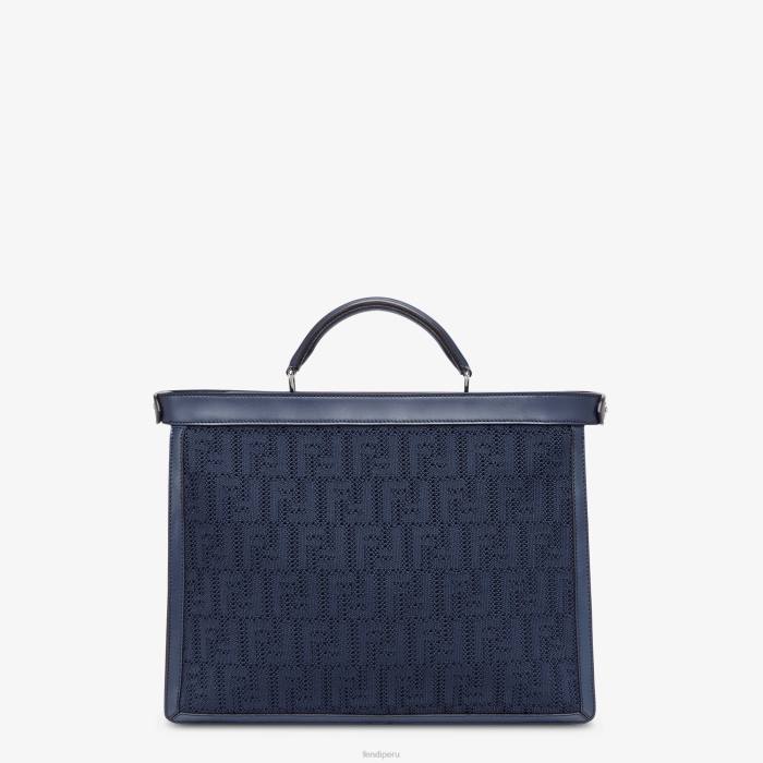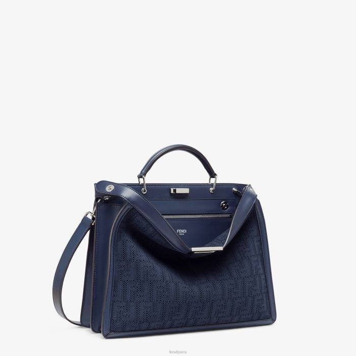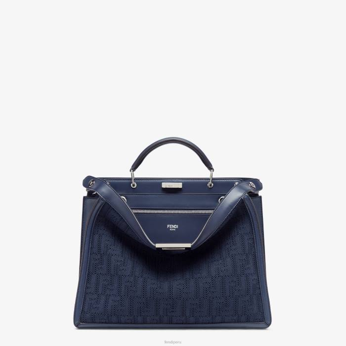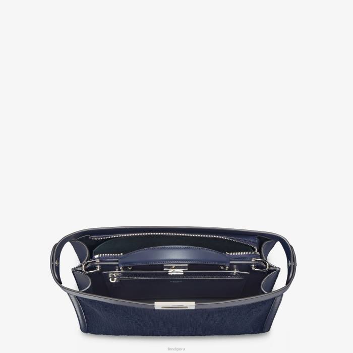 Bolso peekaboo iseeu mediano, confeccionado en piel azul oscuro y jersey perforado ff.