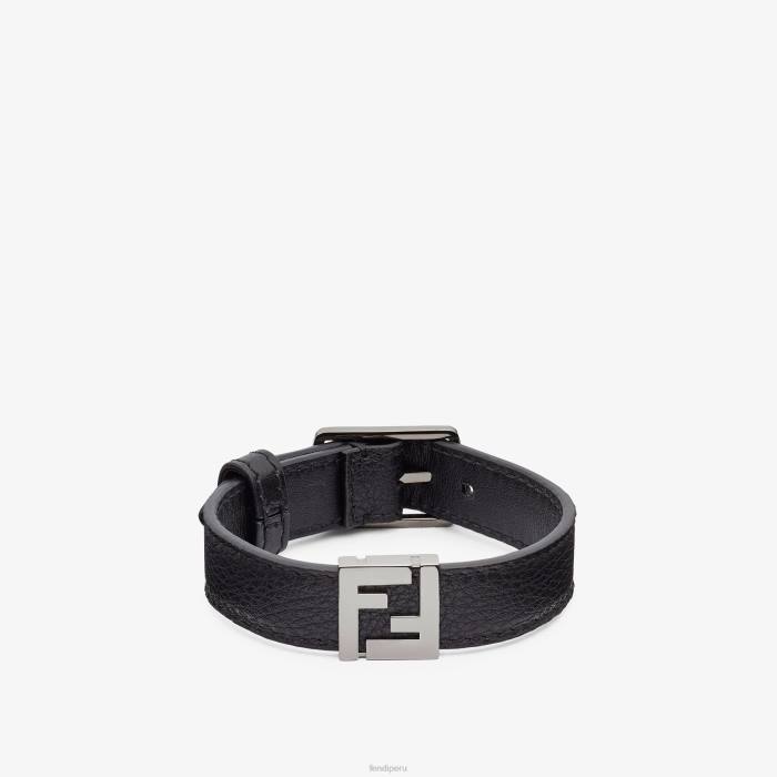 Pulsera reversible con ff de metal y cierre de hebilla, confeccionada en piel cuoio romano negra. forro de cuero negro. Artículos metálicos con acabado en paladio.