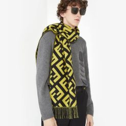 Bufanda rectangular confeccionada en cachemira con motivo FF en diagonal en toda la prenda en negro y amarillo.