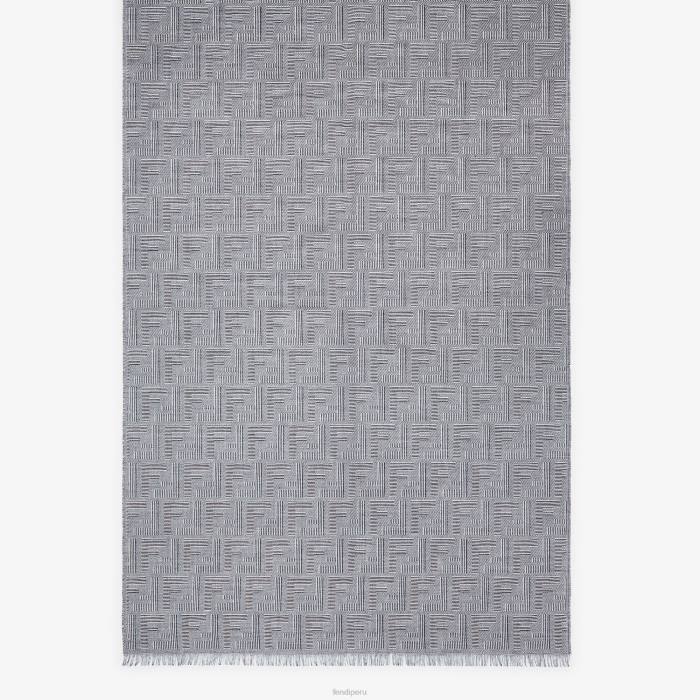 Bufanda rectangular confeccionada en lana y seda con motivo Fendi Shadow por toda la prenda en color azul. adornado con borde con flecos.