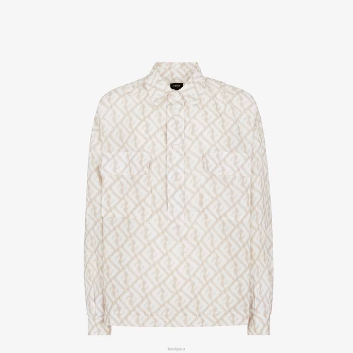 Camisa oversize con cordón en el bajo y bolsillos de parche con solapa en la parte delantera. Mangas escotadas. cierre de botón. Confección en lino con motivo ff diagonal efecto ikat estampado íntegramente en blanco y beige.