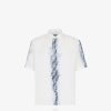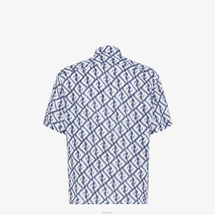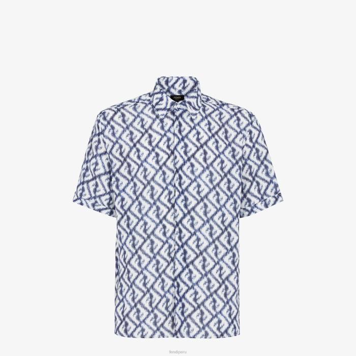 Camisa oversize con cuello estilo italiano y manga corta. cierre de botón oculto. Confección en lino con motivo ff diagonal efecto ikat estampado íntegramente en azul y blanco.