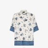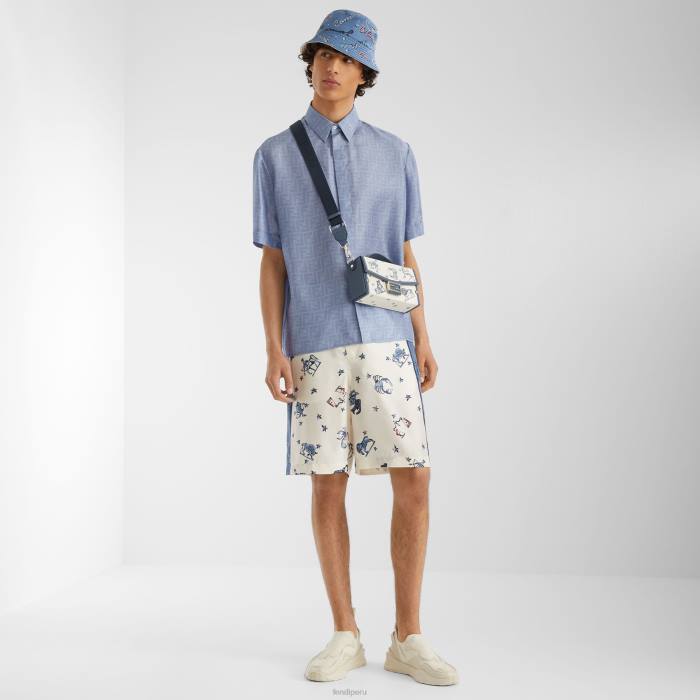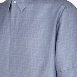 Camisa oversize con cuello estilo italiano y manga corta. cierre de botón oculto. Confección en seda azul claro con motivo ff en jacquard por toda la prenda del mismo color. botón superior visible.
