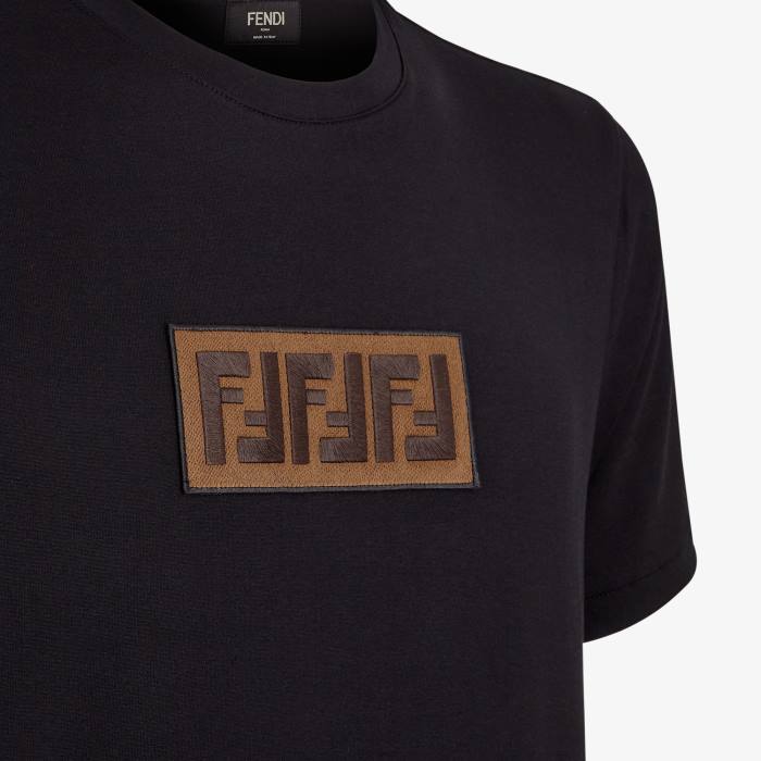 camiseta de corte regular. cuello redondo y manga corta. confeccionado en suave jersey de algodón negro. personalizado con parche de ante y motivo ff marrón.