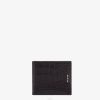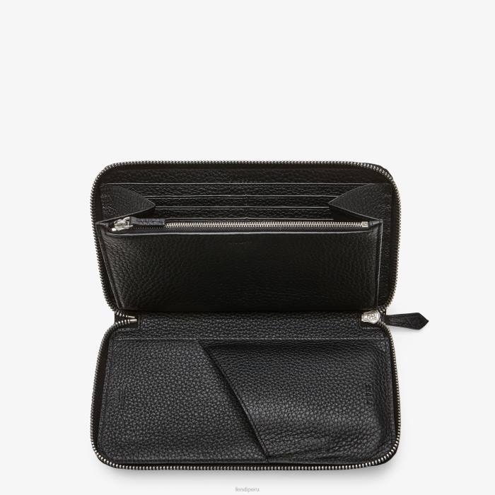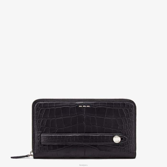 Cartera continental rectangular con cierre de cremallera en tres lados. dividido en un bolsillo para el teléfono y un compartimento reforzado con características de billetera que consisten en una ranura para tarjetas, un bolsillo para el pasaporte y un compartimento para monedas con cremallera. Realizado en caimán acabado satinado negro. rematado con ribete y decoración de puntadas metálicas. Forro de piel romana negra. Artículos metálicos con acabado en paladio.