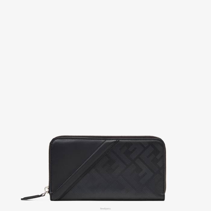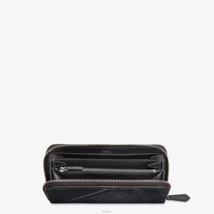 cartera con cremallera. organizado en tres compartimentos reforzados con ocho ranuras para tarjetas y un bolsillo con cremallera. Confección en cuero Fendi Shadow negro con motivo ff texturizado a rayas. detalle diagonal de cuero negro.