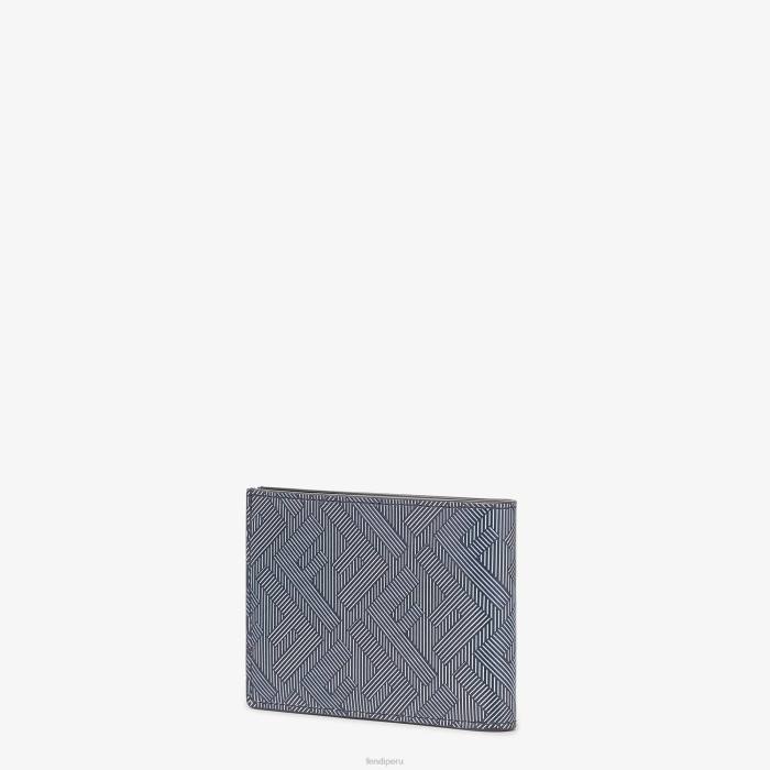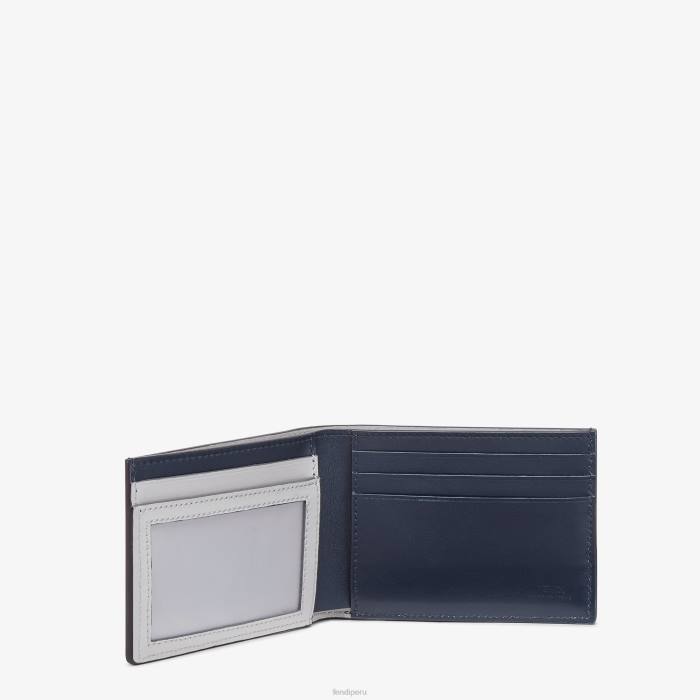 Cartera plegable con compartimento para billetes, cuatro ranuras para tarjetas y un bolsillo para documentos revestido con textura transparente. Confección en piel Fendi Shadow en gris claro y azul, con motivo ff de rayas texturizadas. Forro de piel blanca y azul. Letras Fendi Roma y artículos metálicos con acabado en paladio.