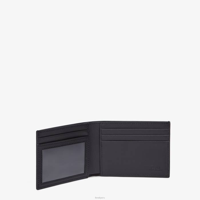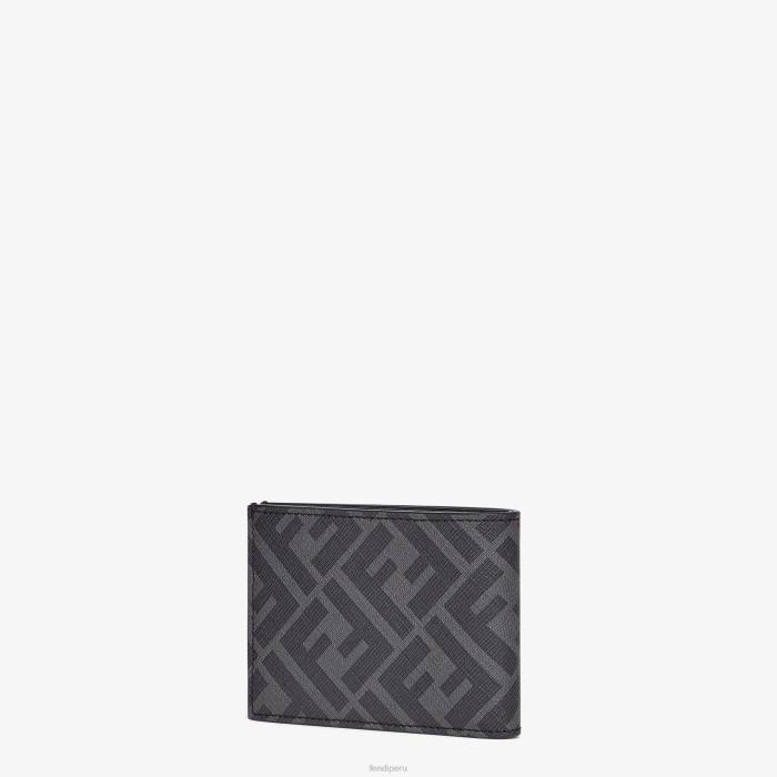 Cartera plegable con compartimento para billetes, cuatro ranuras para tarjetas y un bolsillo para documentos revestido con textura transparente. Confección en tela texturizada de color gris con motivo ff. adornado con inserción de cuero negro y detalle de incrustaciones amarillas. Forro de piel negra.