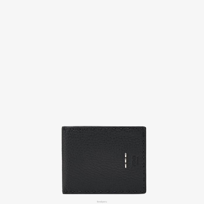 Cartera plegable selleria en piel romano negra, adornada con costuras a mano y presillas de metal con acabado paladio. Forro con cuatro ranuras para tarjetas, un compartimento para billetes y un práctico monedero con botón de presión.