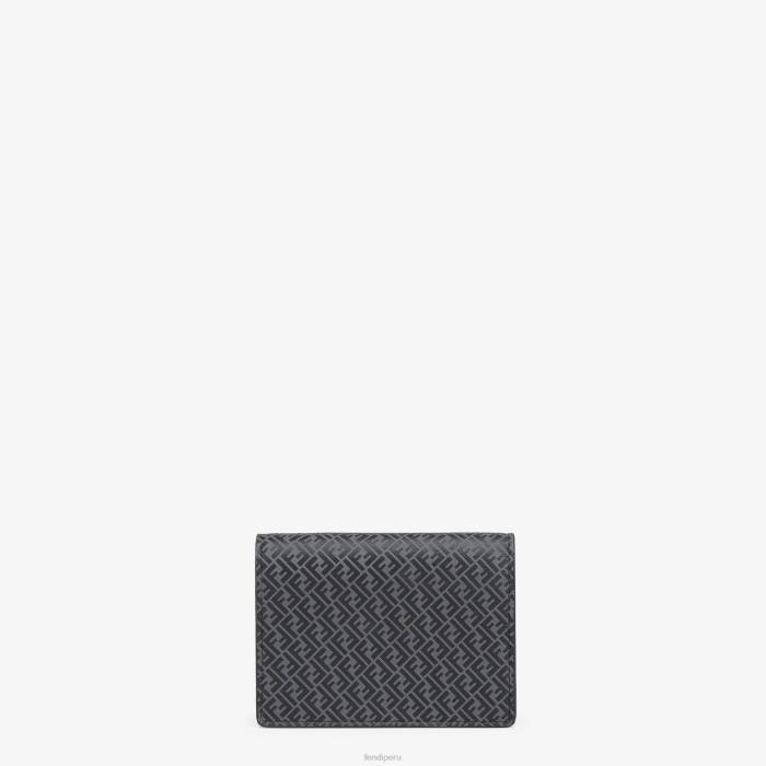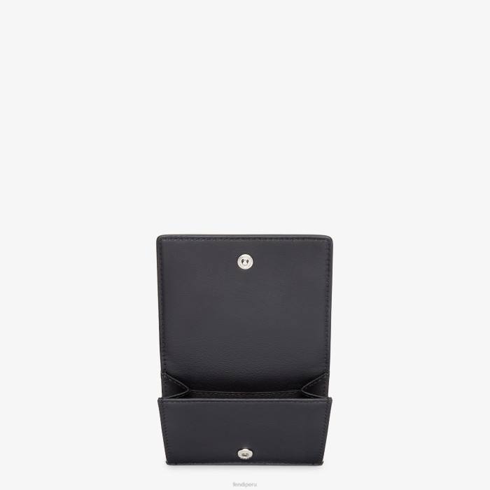 Cartera con dos compartimentos internos para billetes y bolsillo exterior con cierre a presión. Confección en piel con microestampado ff grabado en negro y gris. Forro de piel negra.