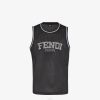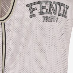 Chaleco estilo baloncesto de malla técnica blanca. personalizado con letras fendi roma en contraste bordadas en la parte delantera. Bordes de punto a rayas blancas y negras.