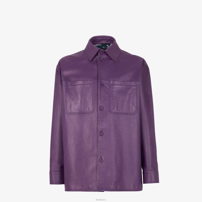 Chaqueta estilo camisero con cuello de pico y dos bolsillos aplicados en el pecho. Manga larga con puño camisero. cierre de botón. hecho de suave color morado. adornado con un detalle ff de metal con acabado paladio en la parte posterior del cuello.