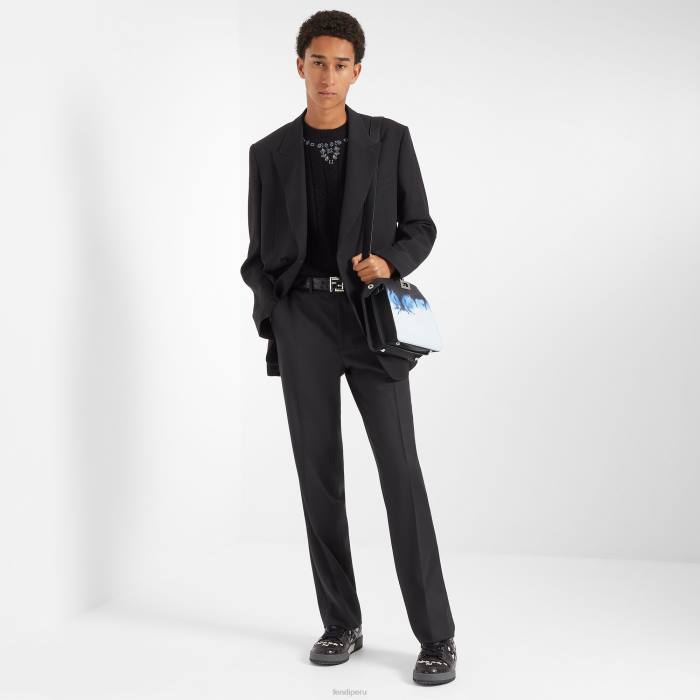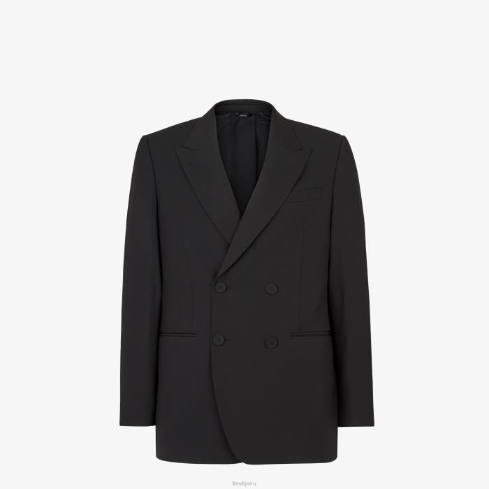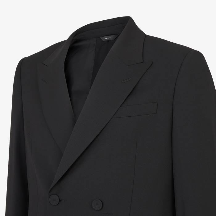 Chaqueta cruzada de corte recto. solapas de pico, bolsillo en el pecho y bolsillos de ribete. Cierre con botones forrados. hecho de lana negra. El modelo presenta una cremallera larga en el centro de la espalda con un deslizador Fendi O’lock y una etiqueta Fendi Roma en jacquard en el dobladillo. forrado.