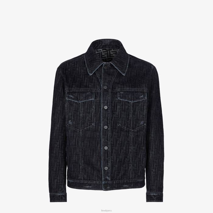 Chaqueta oversize con cuello camisero y bolsillos de parche en el pecho. sin forro. cierre de botón. Confección en denim azul con motivo ff flocado por toda la prenda.