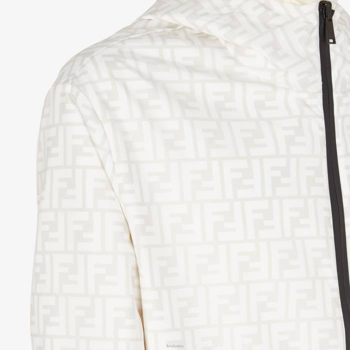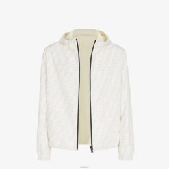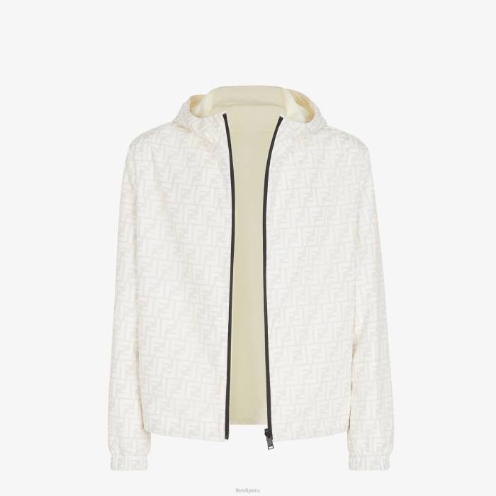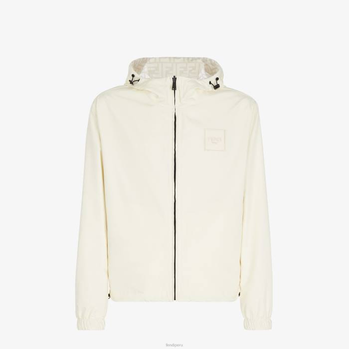 Chaqueta reversible con capucha y bolsillos laterales. El modelo tiene un ajuste relajado con puños y dobladillo inferior elásticos. cierre frontal con cremallera. fabricado en nailon. un lado está personalizado con un motivo ff integral en blanco y el otro en color beige liso con un parche cuadrado de Fendi a juego.