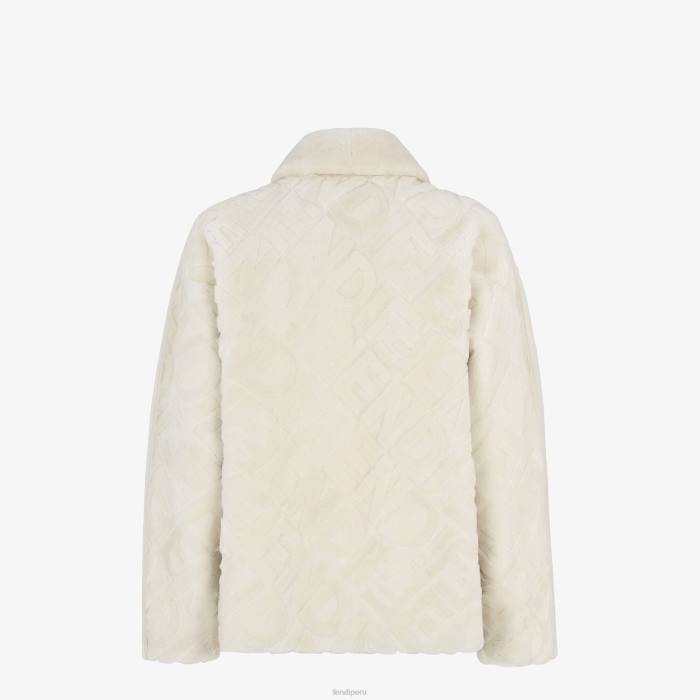Chaqueta recta con cuello camisero y bolsillos laterales. Cierre de cremallera con doble cursor. Confeccionado en borreguito rasurado blanco. la parte trasera está personalizada con un motivo fendi diagonal de gran tamaño en relieve.