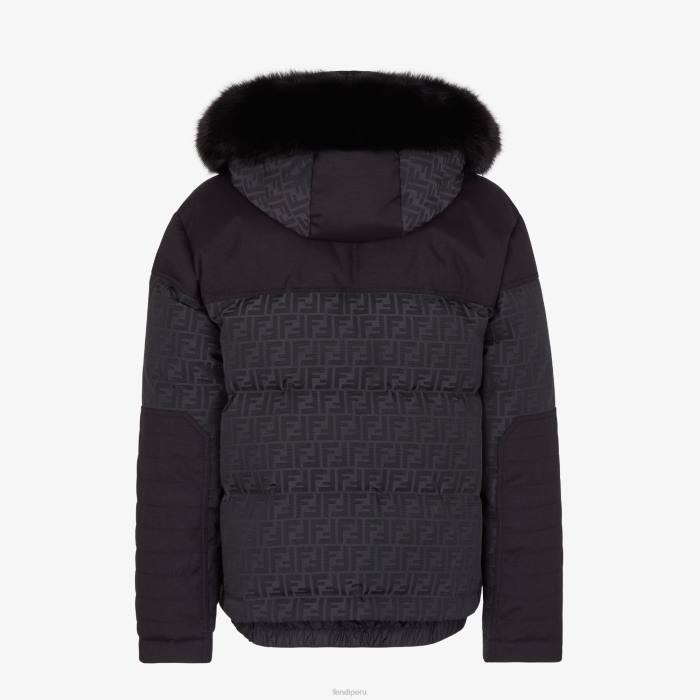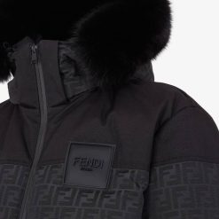 Chaqueta de esquí con cuello alto y capucha extraíble. bolsillos laterales con cremallera. la construcción con un faldón paranieves desmontable y resistente al viento garantiza un alto rendimiento. Cierre de cremallera resistente a la lluvia. Confeccionado en tejido técnico negro impermeable y cortavientos. Adornado con motivo FF en jacquard e inserciones de color liso en el canesú, los hombros y los bolsillos delanteros. acabado con parche FF cuadrado de goma y ribete de capucha de pelo de zorro negro.