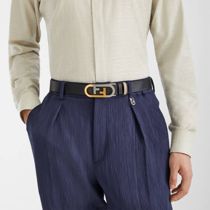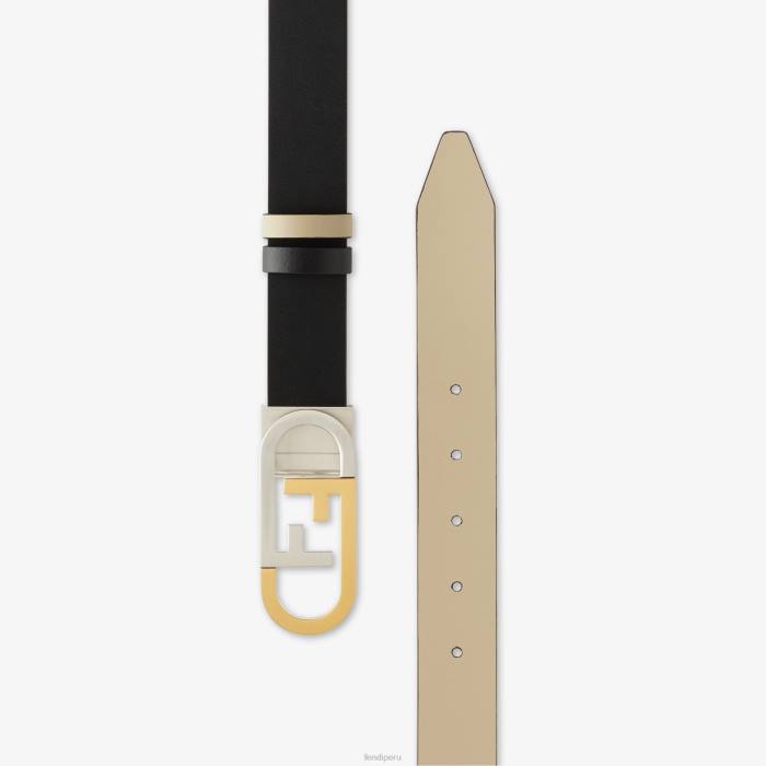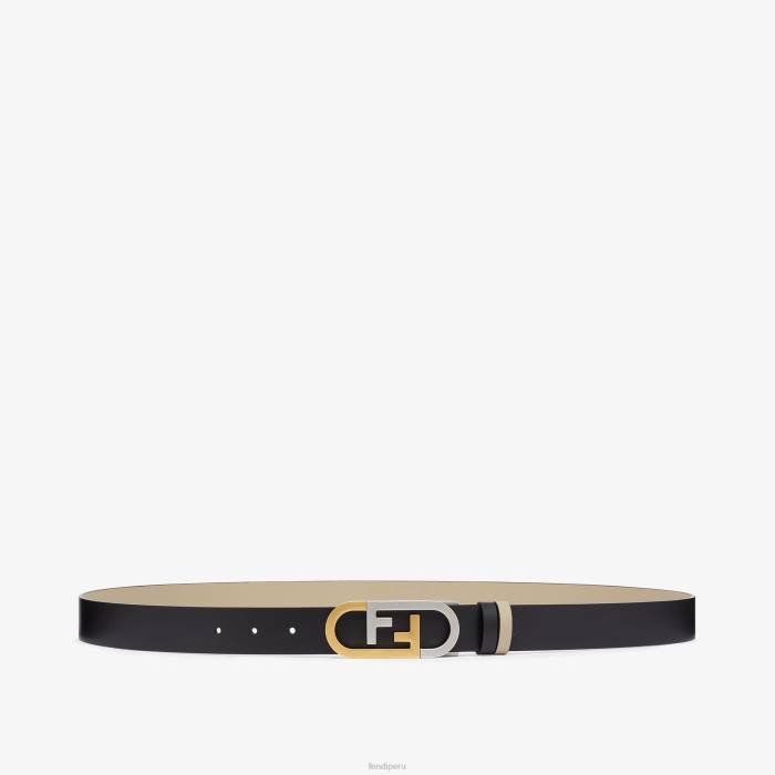 cinturón ajustable y reversible. Hebilla fendi o’lock con acabado en paladio y oro. confección en piel lisa negra con forro beige en contraste.