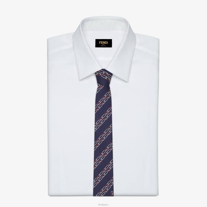 corbata de seda. ancho: 6,5 cm. en azul, adornado con motivo diagonal fendi o’lock de cadena blanca y roja.