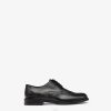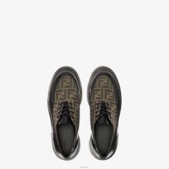 Zapatos con cordones con delantal cosido a mano y cierre con cordones. fabricado en cuero negro. Detalle de tejido jacquard ff en tonos tabaco y negro. suela de goma con detalle f grabada en el lateral.