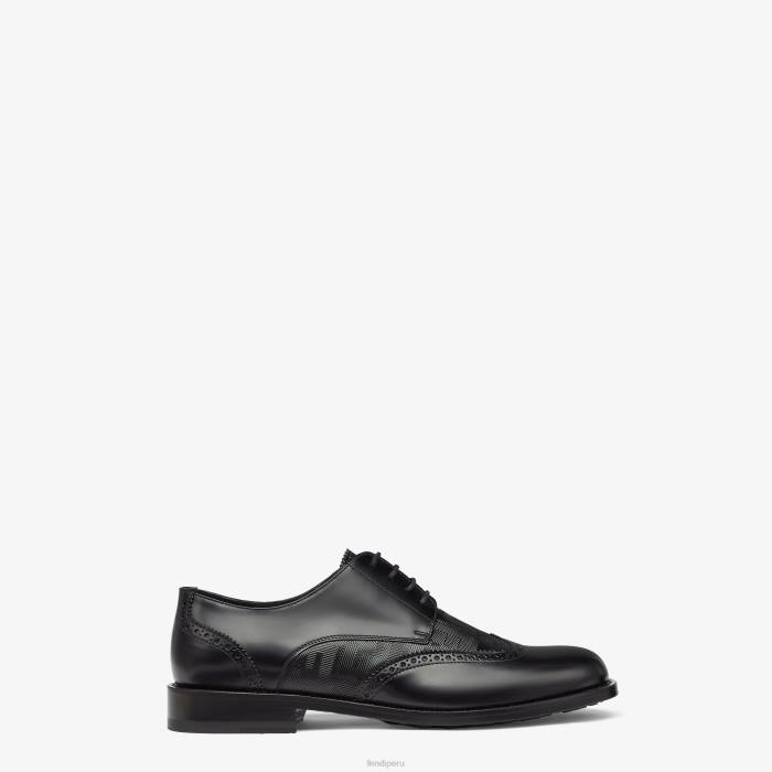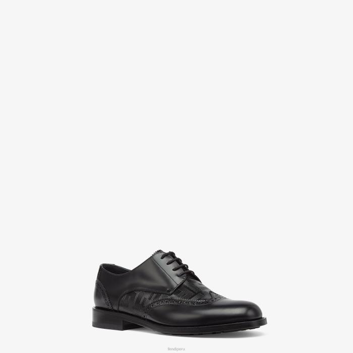 Zapatos derby con cordones y costuras brogue. fabricado en cuero negro. adornado con cuero Fendi Shadow con motivo ff tono sobre tono y raya texturizada.