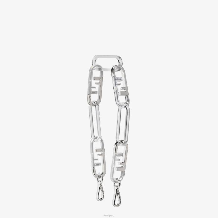 Bandolera corta de malla con cadena y doble clip, para usar en combinación con cualquier bolso con ganchos. Realizado en metal con acabado paladio y plexiglás transparente. adornado con detalles de fendi o’lock.