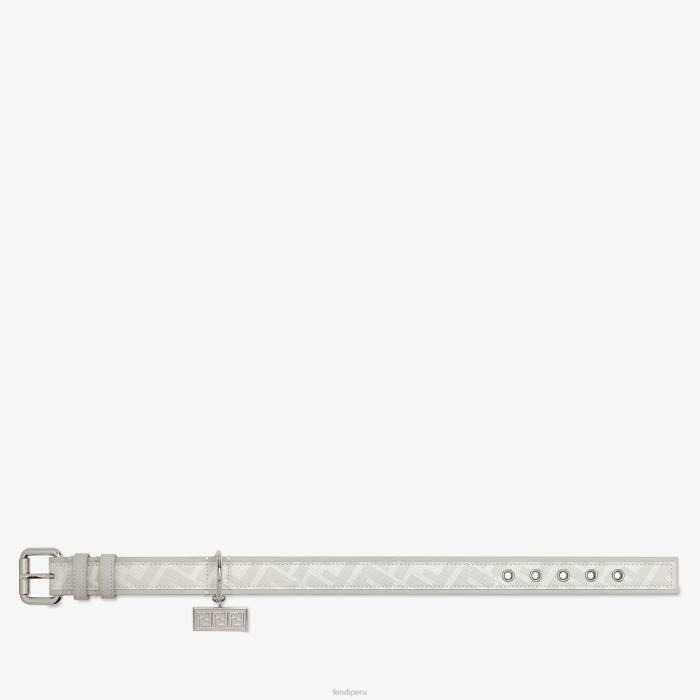 Collar para perros con placa con nombre personalizado ff en relieve. Cierre ajustable con hebilla metálica. Confección en tela con motivo ff blanco y gris claro. Detalles de cuero blanco. Artículos metálicos con acabado en paladio.