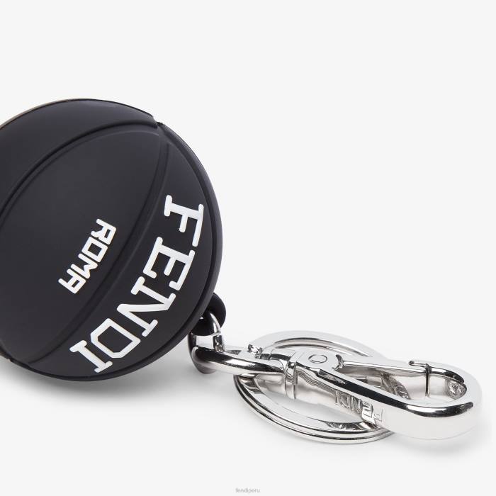 Charm en forma de pelota de baloncesto con clip y anilla con logo. Confección en goma negra con estampado fendi roma blanco. Artículos metálicos con acabado en paladio.