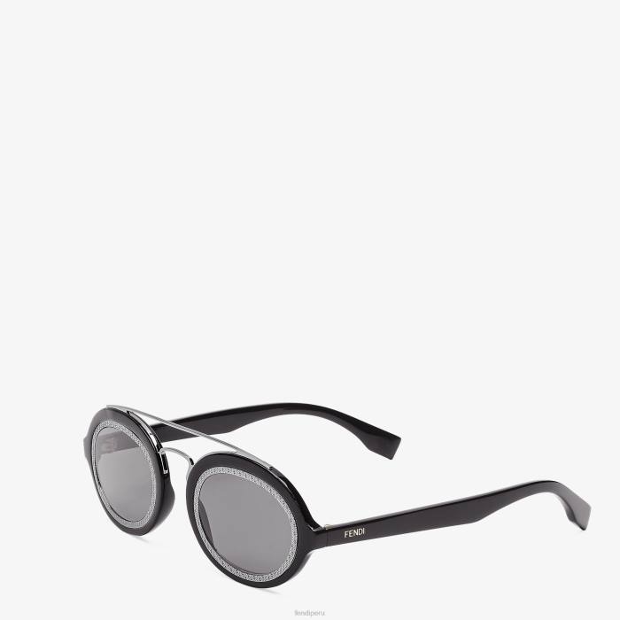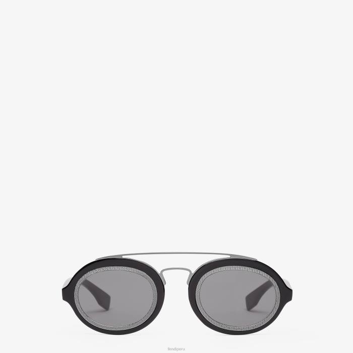 presentado en el desfile primavera verano 2023. Gafas de sol ff around ovaladas en acetato negro. Doble puente y llantas de metal de rutenio negro con motivo ff grabado. lentes gris oscuro.