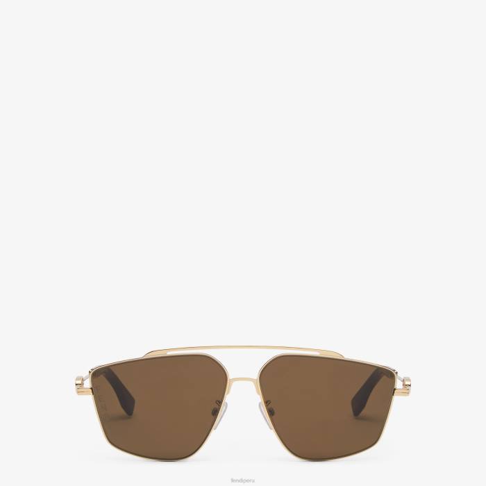 Gafas de sol fendi o’lock pilot cuadradas en metal dorado. Doble puente y patillas finas con logo fendi o’lock. almohadillas nasales ajustables y puntas de acetato habano oscuro. lentes marrones.