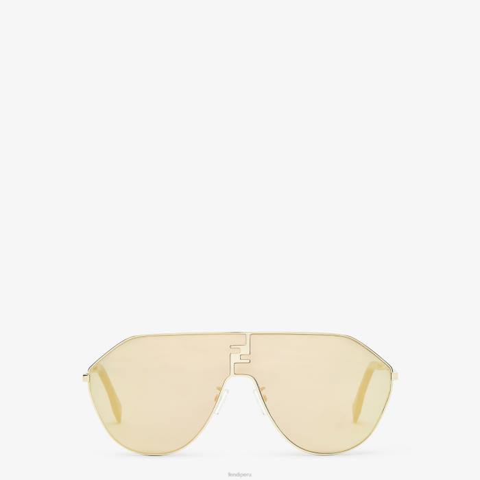 Gafas de sol extragrandes con escudo ff match en metal dorado claro. Logotipo ff recortado en la lente. almohadillas nasales ajustables y puntas de acetato habano oscuro. lentes grises con efecto espejo ultraamarillo.