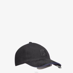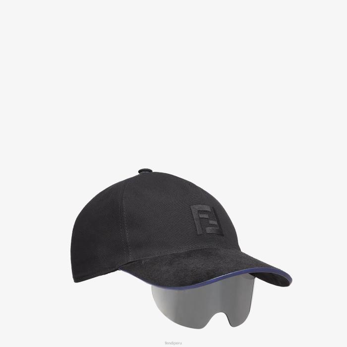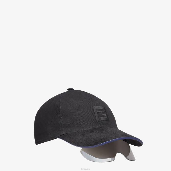 Presentada en el desfile otoño/invierno 2021, esta gorra de béisbol tiene una lente protectora integrada. Confeccionada en lona negra con el logo ff y con visera de ante tono sobre tono con ribetes azules en contraste. la lente única con espejo plateado se pliega fácilmente debajo de la visera.