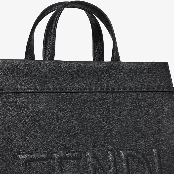 Bolso shopper mediano confeccionado en piel plena flor negra, con logo fendi roma con efecto 3D. Pespuntes cosidos a mano tono sobre tono y lazo anudado en el lateral.