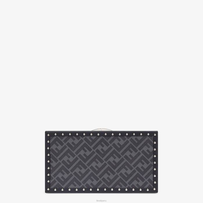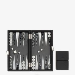 Juego de mesa backgammon fabricado en tela ff negra y gris con detalles en piel negra y forro de plexiglás gris y blanco. Fichas de plexiglás adornadas con detalles de metal ff. Artículos metálicos con acabado en paladio.