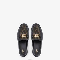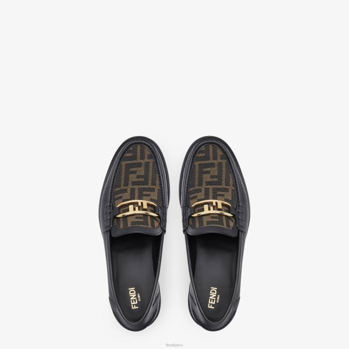Mocasines con delantal cosido visible y parte superior decorada con detalle fendi o’lock. Confección en piel negra con aplicación de tejido jacquard ff. artículos de metal con acabado dorado.