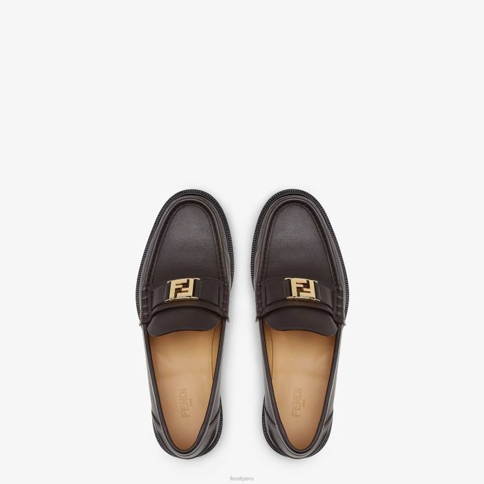 Mocasín con motivo ff. fabricado en cuero marrón. suelas de cuero. artículos de metal con acabado dorado.