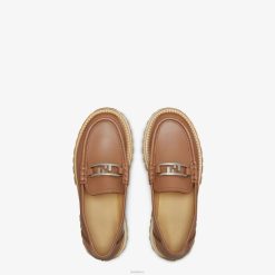 Mocasines con delantal cosido visible y parte superior decorada con detalle fendi o’lock. fabricado en cuero marrón. Accesorios de metal con acabado paladio. suela de goma grabada.