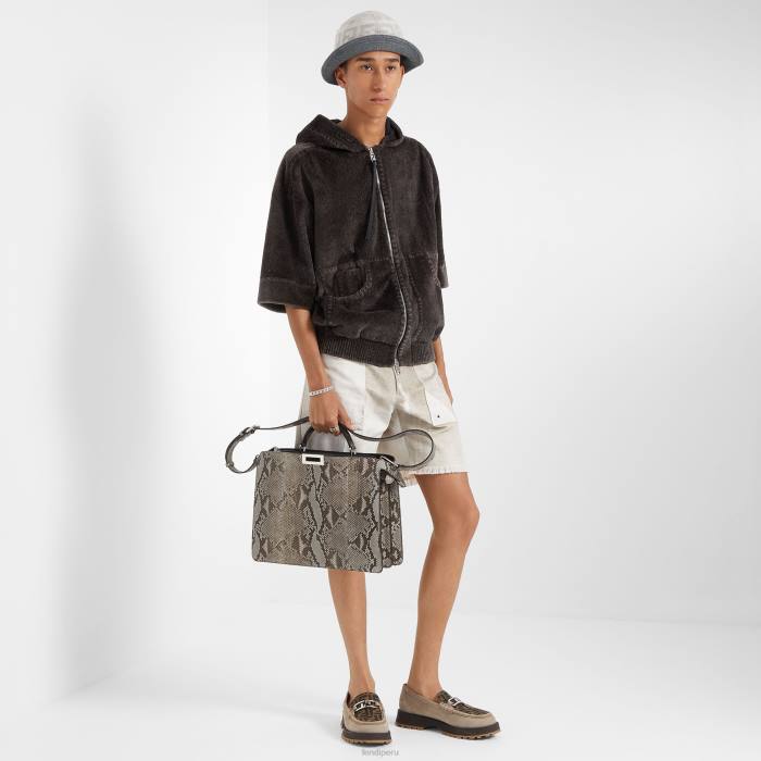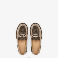 Mocasines con delantal cosido visible y parte superior decorada con detalle fendi o’lock. Confeccionado en piel nobuck beige. Delantal zapato en tejido jacquard ff marrón y tabaco. Accesorios de metal con acabado paladio. suela de goma grabada.