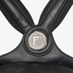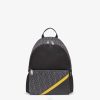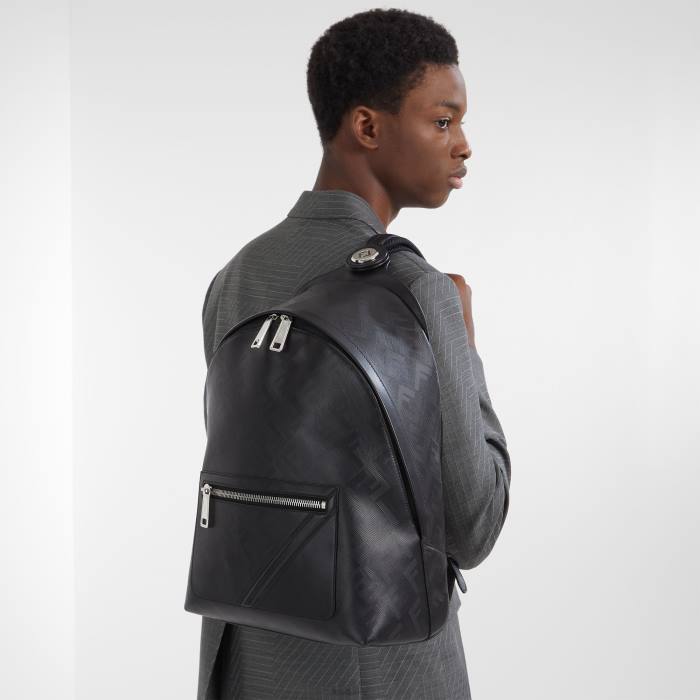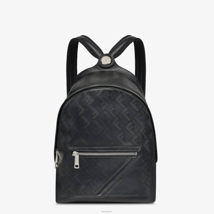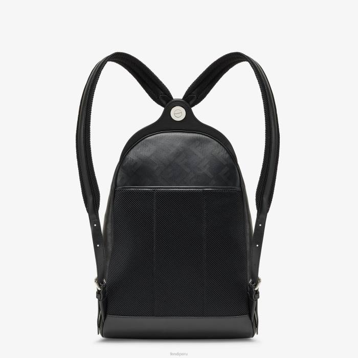 Mochila espaciosa y estructurada. El diseño presenta un remache de metal con el logo ff grabado que une los tirantes y permite usarlo como un solo hombro. Confección en piel Fendi Shadow negra con motivo ff con textura de rayas. adornado con una inserción diagonal de cuero suave tono sobre tono en el bolsillo frontal con cremallera.