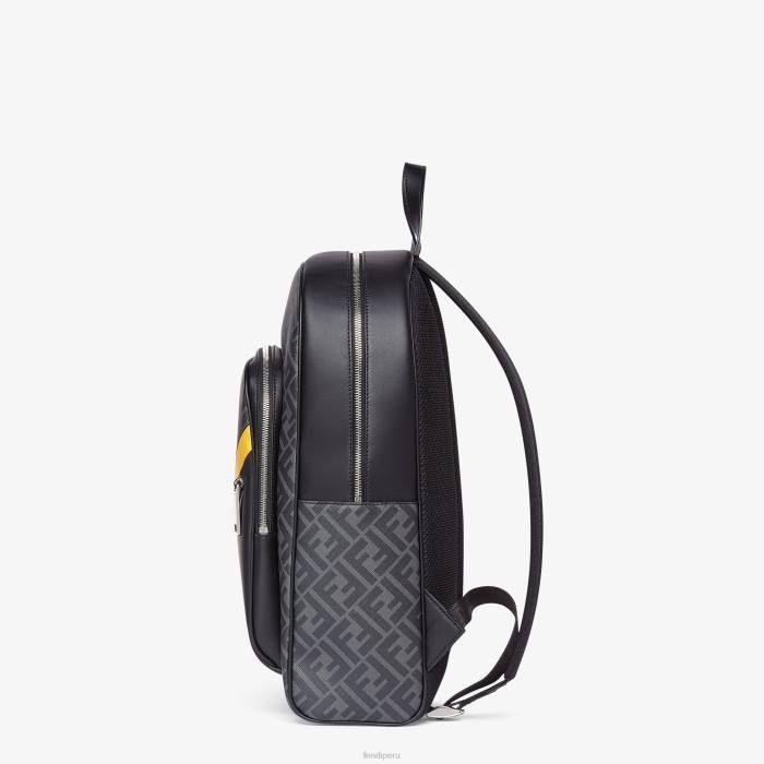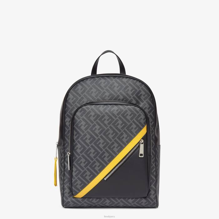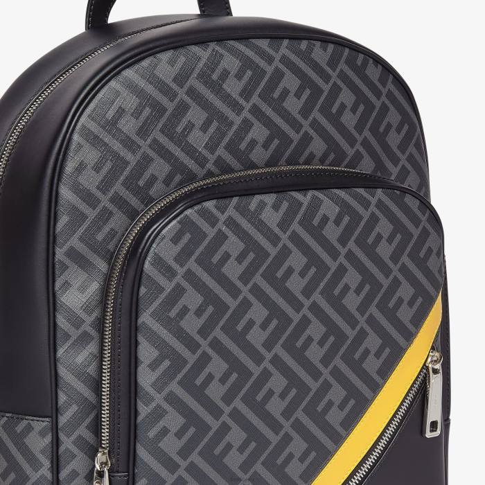 Mochila con bolsillo delantero confeccionada en tejido con motivo ff en color negro y gris. adornado con una inserción diagonal de cuero negro y amarillo.