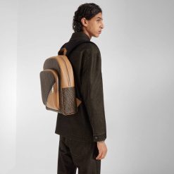 Mochila con bolsillo frontal confeccionada en tejido con motivo ff en tono marrón. adornado con una inserción diagonal de cuero negro y amarillo.
