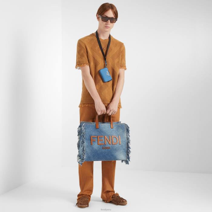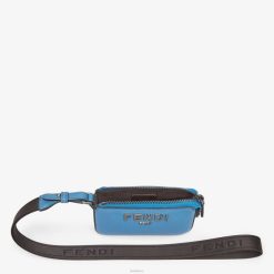 Monedero con cierre de cremallera y asa desmontable. Confección en piel flor azul claro. Correa para el hombro de cinta técnica negra adornada con letras Fendi. Letras Fendi Roma y artículos metálicos con acabado de rutenio ultranegro.